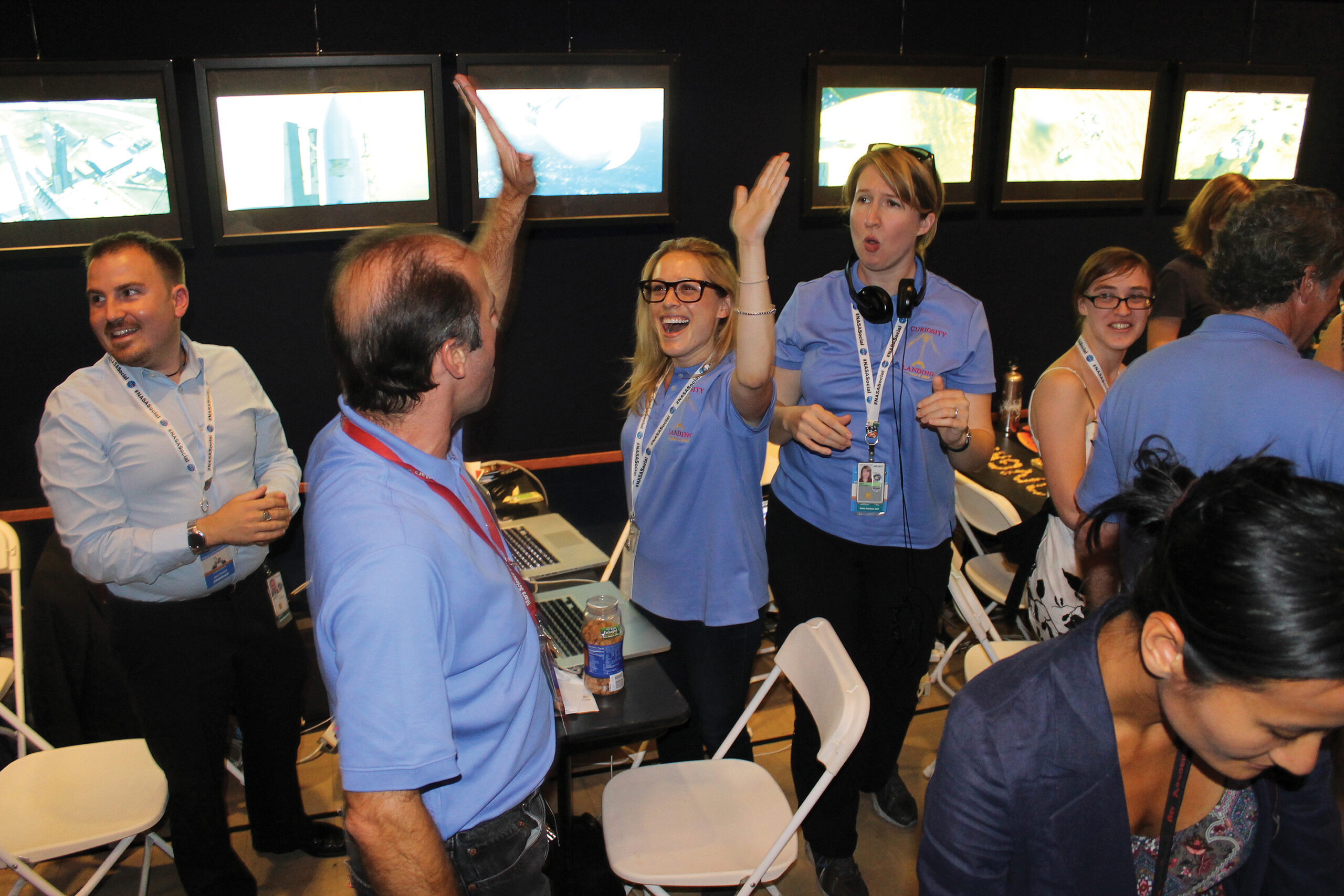 In the minutes leading up to Curiosity’s landing, the tension in the auditorium housing the social attendees and expectant members of the press could be carved with a knife. With each success of Curiosity’s chain of impossibly difficult descent procedures, the social attendees erupted in euphoric applause. When the call went out that Curiosity was safely on the surface, that euphoria manifested itself as an exuberant demonstration of affection and tears of elation.