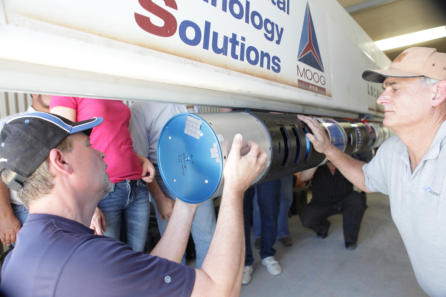 Two days before the flight, UP Aerospace workers prepared the cylinders for insertion into the rocket at Spaceport America. A credit-card-size opening in the side of each canister provided access so the students could inject the liquid and gel growth mediums through tube systems they had designed.