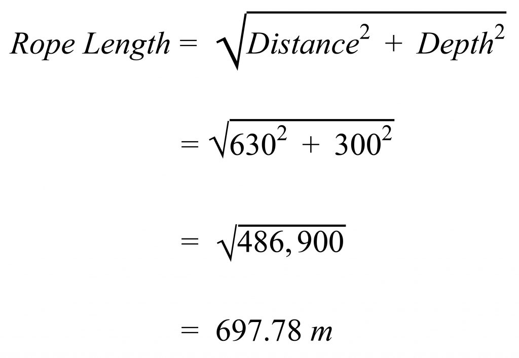 To solve this hypothetical problem, we use basic trigonometry. The hypotenuse of the triangle is the length of rope needed for the traverse, the adjacent side is the Distance, and the opposite side is the Depth. The slope is the angle between the hypotenuse and the adjacent side. Dashed lines are provided to help with the measurements.