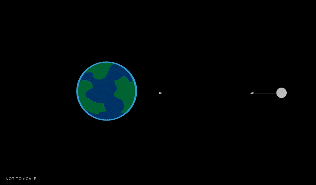 This tidal force causes the oceans to slosh around in two bulges that point toward and away from the Moon. They do this because the gravitational force pulling on Earth by the Moon isn’t just an average force that’s the same strength everywhere. The Moon’s gravity is strongest on the closer side of the Earth, creating a bulge of water pointing toward the Moon. It’s weaker on the opposite side of the Earth, which leaves another bulge of water that lags behind the rest of the Earth.
