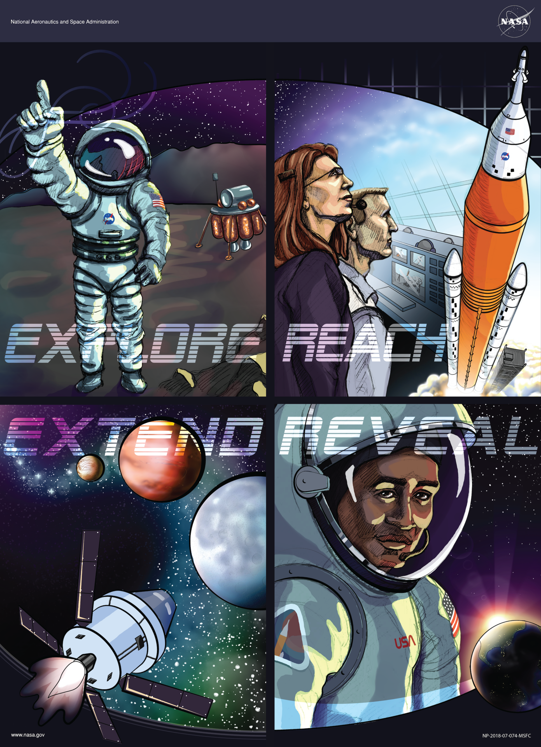 The Exploration Systems Development posters highlight many of the exciting ways NASA will explore deep space in the near future. A limited addition poster format was originally distributed at Comic-Con 2018 and has since been modified and made available for public and educational use.