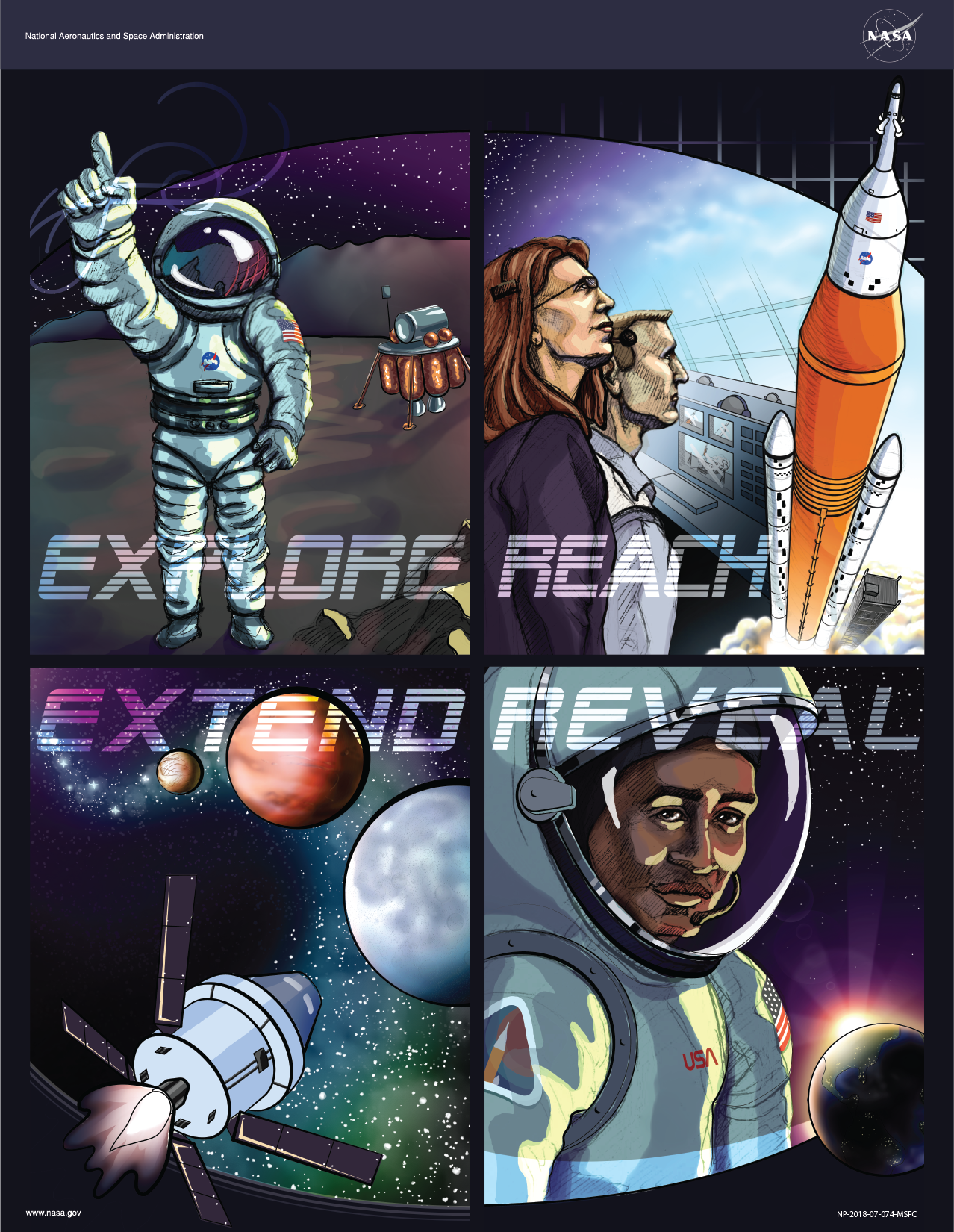 The Exploration Systems Development posters highlight many of the exciting ways NASA will explore deep space in the near future. A limited addition poster format was originally distributed at Comic-Con 2018 and has since been modified and made available for public and educational use.